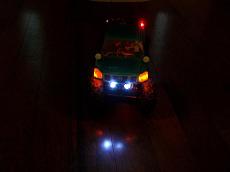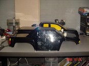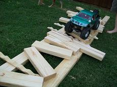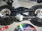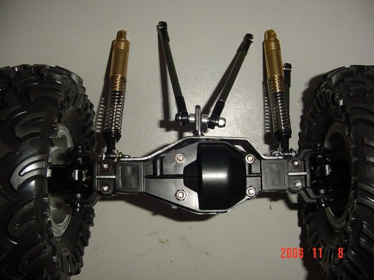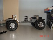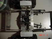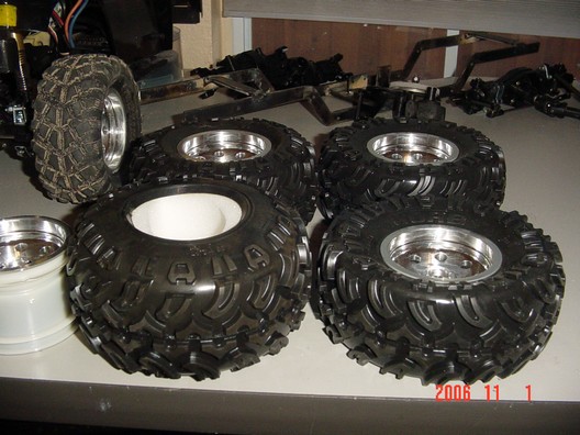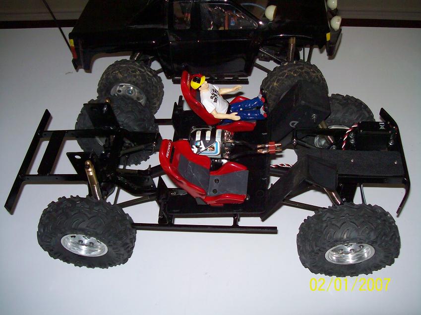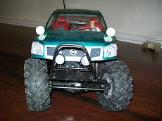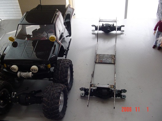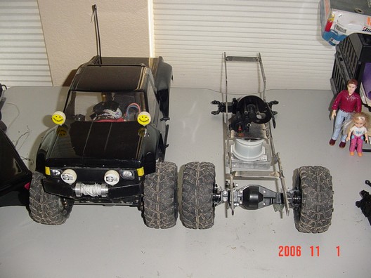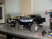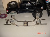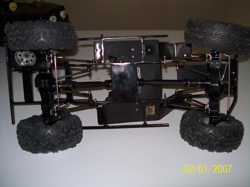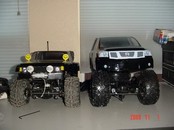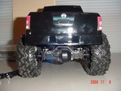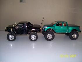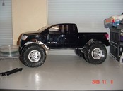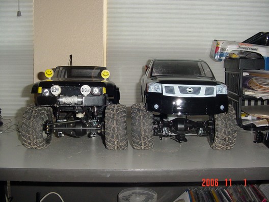 The new clear Parma Titan lexan body is way bigger than the D21. I need to lenghten the wheelbase. I decided to make a jig for the frame rails. Drilled one hole, then bolted together. Then drilled another hole. Bolted together etc. Then I grind/sand the rails equal to each other. The bottom rail is TWO rails bolted together all drilled for link mounts. This is my marker template on the table. I layed the Titan body down drew the wheel well centers and made my frame rails to match body lines. I made a jig out of a 1.5 x 3 tube. Its the perfect size for placing the cross members above and below the frame rails. I made some trans mounts for the stealth. One is 1" flat stock the other side is 3/4" flat stock. Both 11gauge. I test fit some geos on narrowed rims from the HardBody. I wanted something a little bigger and got some Moabs. Left frt is stock. left rear is mounted stock on stock rim. Right rear is half foam stock rim. Right front is narrow rim half foam. I will narrow the rims. This is stock rims. I narrowed the rustler rims to same as the other King Cab. I cut the foam in half and glued tires on. I locked the difs with jb weld and installed bearings. I finished the 16g shock towers. I made all 4 links 3" threaded rod. With OEM ends, covered with brakeline. I then decided to do a completely different 4 link design from stock. I moved all the brackets and made a new upper mount from 11gauge steel. It was too heavy so I made some 16g steel versions. This is the new lighter version. Just bent it up in the vise. much easier than all that welding and cutting. I keep throwing the body on to check wheels line up in wheel wells. I had to enlarge the holes a little. Here is a great pic of stock tlt mounts and new style. No more rear steer. I am going to convert the D21. Rolling chassis profile. I am missing 2 end links. So the frt end is on hold. Mounted the trans and driveshafts. I decided to gve this one to my Son and he likes Green. So I bought a new body. Here it is compared to the Hardbody King Cab. I added a light kit. Decided to widen the track width for tighter turning.