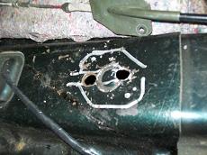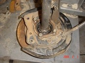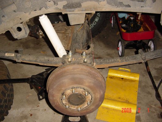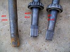 pads. The d22 (Frontier 1998-2004) Has 33 spline axles so does the R50 (96-2004) pathfinder and WD22 Xterra. I have never tried pressing the backing plate off the putting on the 33 spline axles yet. I read it can be done. I swap axles when I install the discs in the below examples. This is the d21 stock setup. Note this has aftermarket 4" lift springs, upper spring plate and a U bolt flip. Just unbolt 4 17mm nuts and axle slides out, very easy. Disconnect brake line and p brake cable. I removed the dust shields since they where trashed. Dont need them anyway. Dont want dirt and rocks stuck in there. The shields are welded on so I used a cut off wheel and grinder. I just removed all the flimsy light gauge steel. The caliper bracket is part of the backing plate. I did replace one of the studs. I think there is a slight difference in length. There is a procedure in the FSM to shim the end play. Or you can grind 20th off the disc axle. I think its a hair longer. I had to relocate the hard line connection. I did not have the WD21 axle hardlines. I just cut it off and welded it up top. Hose still allows caliper to swing on pin. Another option is to swap the backing plates. You will need a press. See more details below. Backing plate and caliper mount with the shoes removed. Drives great. Much better I think. Especially back wards. I Install these Super heavy duty 4x4 brake pads. The ones that came with the used parts were paper thin. Got these from tirerack.com 87-95 Pathfinder rear brake parts are all the same. Rotors, pads calipers etc. Parking Brake cable modifications. Pathy (WD21) on top, Truck (D21) on bottom. Note the pathy handle dumps the cable out a SECOND hole in the rear seat area. UPDATE: I converted to a Pathfinder handle. I had to make a oblong shape hole in floor but it works AWESOME! The cable was easier to lengthen also. I reused part of the drum brake cable and 2 stainless u bolts. I first moved the handle over towards driver seat 1.5" for cup holder room. This is not required for disc brakes. Remove right seat, ECU, seat belt and fold over carpet. Bolt in the pathfinder handle assembly and mark the floor for the holes. Drill 2 holes and connect with airsaw. Since the pathfinder has 2 nuts welded to the bottom of floor I had to weld to bolts to plate. Then add 2 nuts from bottom. Use some gasket sealer to seal up the plate. Now the pathfinder wheel base is 104 compared to my king cab 116. So I made an extension using old cable parts. Updated: 1/5/2011: I decided to make a steel tube extension instead of the cable to cable mess. Works much better, I used the OEM pathy cables at the axles. I had to add a cross member above the Y to keep the cables above the driveshaft under flex. Its a 1.5 tube 1/8 thick about 23" long. With a 3x3 3/16 flat tab. Its only welded to drivers side now. Later will attach to future 3/16 gas tank skid plate. I modified the OEM skid plate for clearance. If You have a lift block and or a Body lift the cross member may not be needed. The cable can be pulled upwards via a bracket instead of using the cross member. I added a small bracket to keep the cable off the driveshaft under compression. It really made the parking brake work better. Update this bracket is no longer needed since the new cable is shorter and higher. WD21 Pathfinders are super easy to convert. R50 pathfinders have 33 spline axles and will need the backing plates swapped. The axle lengths are different so will have to press the backing plate on. The backing plate is the caliper mount. Just swap out the hard lines and plug in the axles. Its that easy. W/D22 Xterra and Frontiers are a little more involved You need to swap the backing plate because the backing plate is the caliper mount. Here is a drum 33 spline axle tear down The ABS is easy to pop off. Do NOT cut it off.