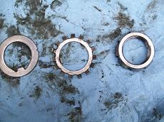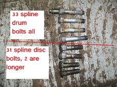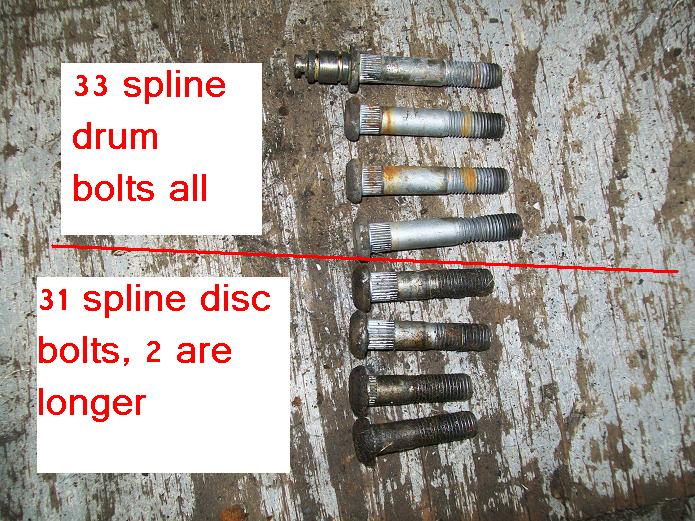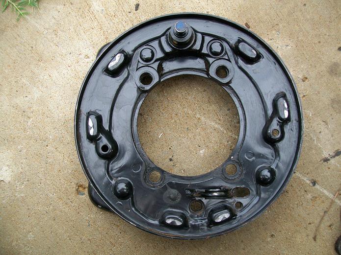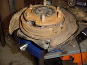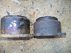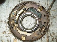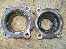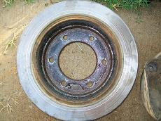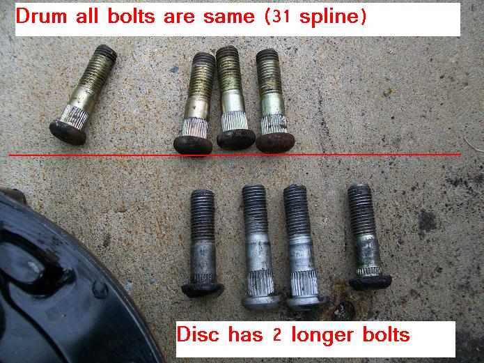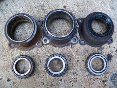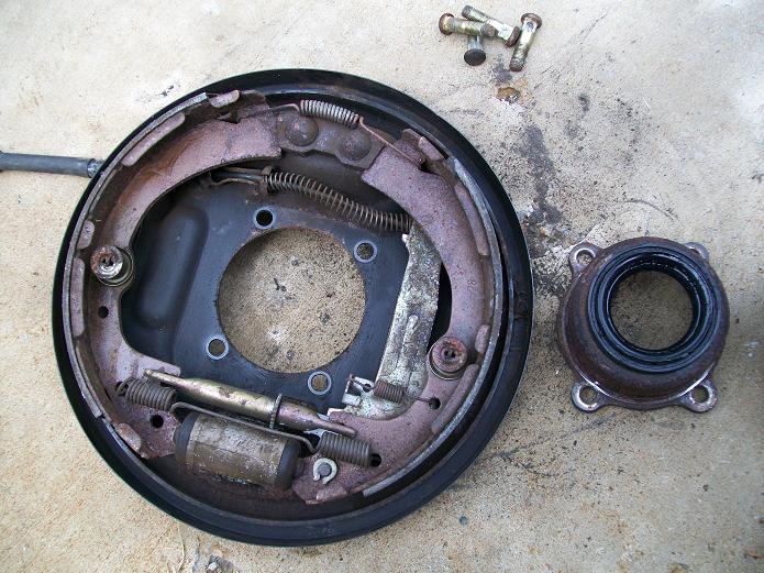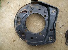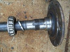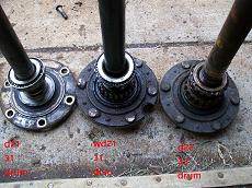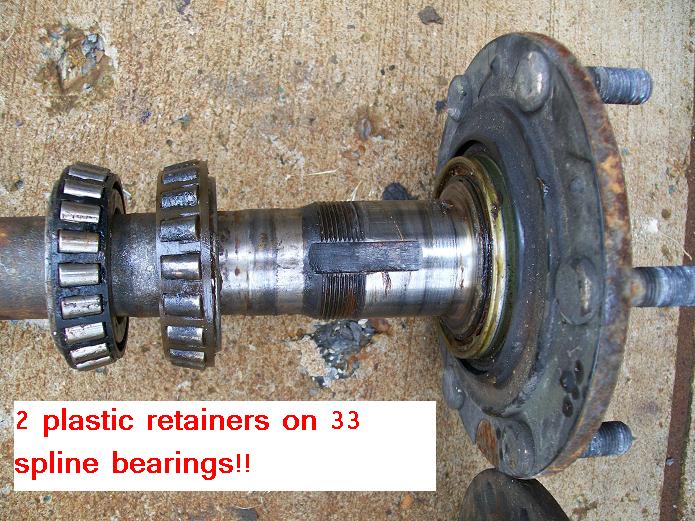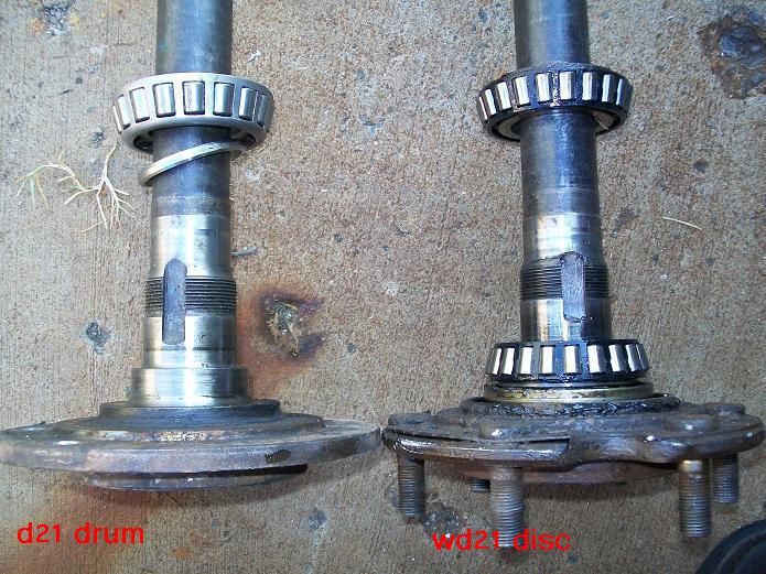 So to put disc brakes on the rear of a R50 and W/D22 you need to swap the backing plates and RETAIN the original bearing retainer. The bearings are all different. BUT the outside dimensions of retainers are all the same. So its plug and play. Axle splines and bearings. Here is the 33 compared to a 31 drum axle. Note 31 spline disc have 2 bearings also. You will need a press to remove the bearings to access the backing plate. I made this from some old steel and end of a rusty axle housing. To press bearing back on reverse tool. The bolts are all different. All for the infamous 87-95 REAR WD21 Pathfinder vented disc rotor. Shoes installed All axles have the same style bearing retainers. 31 and 33 are different sizes.