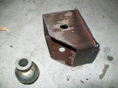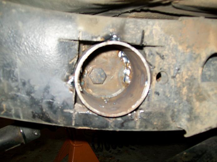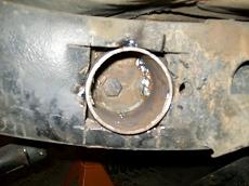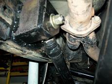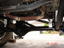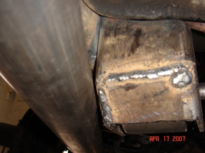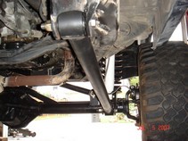 Track bar is a .250 wall DOM. About 26" long. I used a Johnny joint one end and poly bushing on the other. Here is a mockup with the upper link. Some different suspension cycles. ride height: Down travel (stopped by jack stand) Up travel tests. Upper link clearance mockup. Coil springs and retainer mocked. Also shock mocked up. 5.5 Lift springs. Upper link pocket started as a 3x4" 3/16 tube. Added gussets before mounting to frame. Ride height pix. Update : Upper link moved higher to eliminate wheel hop. Found a much better way to mount the upper link to frame. Cut a hole, insert a piece of old driveshaft. Then gusset outer rail. Use same bolt as other mounts. Made a new upper mount pocket from 3x5 3/16 DOM. Added a plate to back. I had to relocate the O2 sensor and Y pipe connection point forward. This gave me room for the Upper link frame mount.