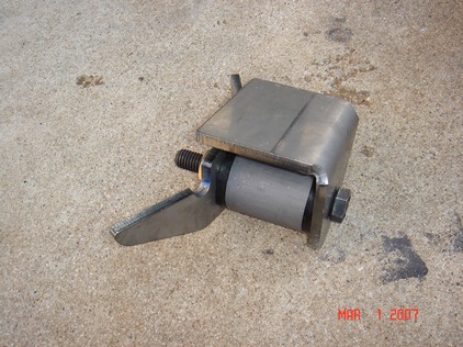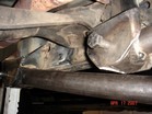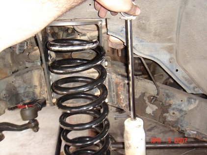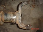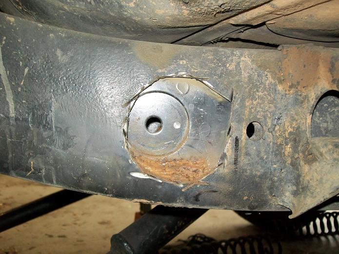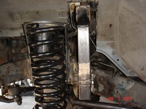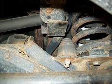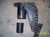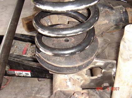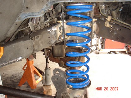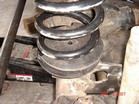 Also found some nice coil buckets, track bar mounts. I added a 3/16 plate to reinforce the frame rail. It is 4" x 8" long. The center of the opening appears to be exactly the center of the motor mount. I used a laser level to create a Vertical line from fender down to concrete. I mounted the Coil buckets 7" from the steering box upper holes. This turned out to be the best placement. 7" from the steering box upper bolt. There is bolt holes on both sides of the frame. The idler holes for Left hand drive models. I added some tube to prevent the coil from falling out at full droop. The tube is the stock D21 driveshaft. The rubber insulator is a stock Wd21 rear upper one. Update. I had to add some more dom to keep the coils in. Also added a limit strap. |