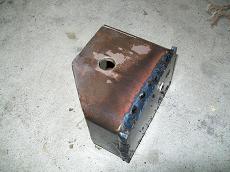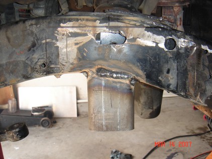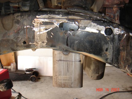 I welded the cross member to the table upside on some 6" blocks. Cut out the old section. Designed a new section with more clearance. Cut and tacked into place. |