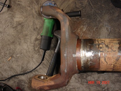 I did this for a number of reasons. I wanted more caster. Less pinion angle. I also wanted to relocate my sway bar mounts and lower shock mounts. First step cut off all perchs, shock mounts. Its allot of grinding and pounding. but basically a very cheap upgrade. The trick is to grind the weld as much as possible. then use a cut off wheel and cut the weld all the way around until you see a crack. Then hit the back of the C until you see it move. You CANNOT turn them. You have to remove then reinstall in the new angle. Some come off easier than others.Then weld everything back on. I finally got the Cs off with a sledge hammer. The C is in the tube 1 1/4. I will weld the Cs back on at 8deg caster at ride height. |